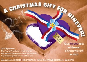 Het Kerstfeest staat weer voor de deur. Laten wij ons ook dit jaar samen inspannen om de kinderen in Assyrië het gevoel van kerst te geven. Naast de cadeau’s voor de kinderen hopen we ook d.m.v. deze actie de kinderen en hun families te helpen terugkeren naar hun huizen. Elke donatie groot of klein is meer dan welkom!